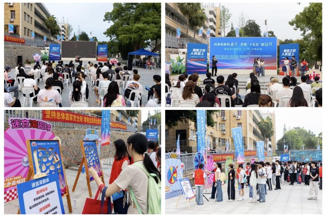 4月14日,福清市2026年“4·15”全民国家安全教育日主场活动在我校举行。我校党委副书记张苏,福清市委副书记陈恒东,福清市委常委、政法委书记王言霖出席活动。市校相关部门负责人以及我校师生参加活动。活动涵盖“福清市海外利益保护研究中心”、“中印尼法律、文化与经贸研究中心”揭牌仪式、“总体国家安全观”专题讲座、国家安全知识系列趣味活动等环节。在赫曦广场,学生志愿者围绕间谍行为危害、公民维护国家安全的权利义务、守护国家秘密的青春责任等主题,用通俗易懂的语言开展现场讲解。国安保密知识互动游戏环节吸引众多同学踊跃参与,大家在轻松氛围中巩固了国家安全意识与法治素养。本次活动聚焦校园主阵地,以“法制宣传+文艺演绎+趣味互动”的创新形式,筑牢校园国家安全防线。